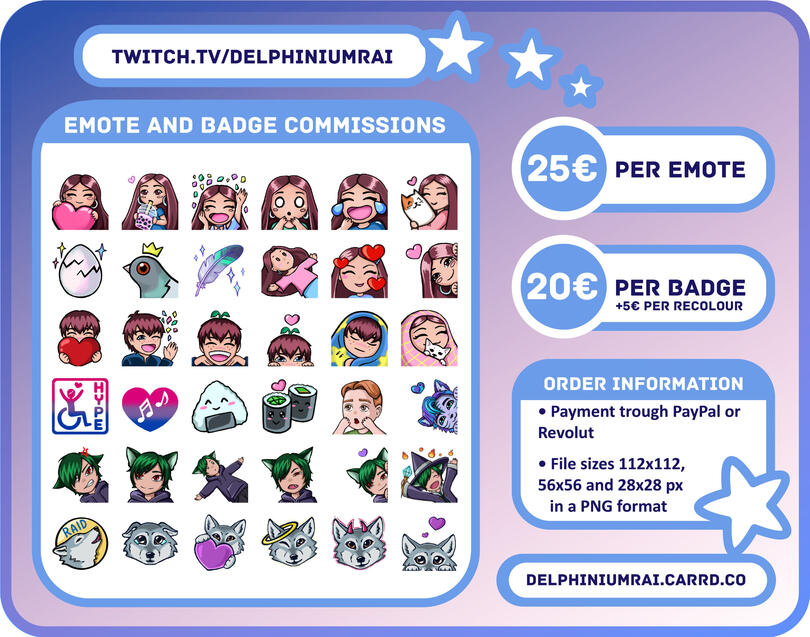 • You will receive your emote(s) ready for upload in the 3 standard sizes (112x112px, 56x56px and 28x28px)